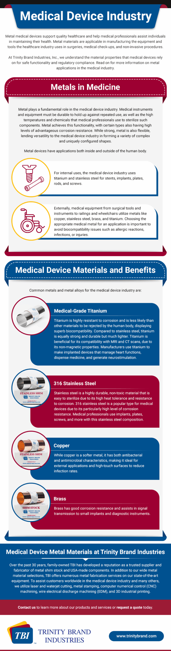 At Trinity Brand Industries, Inc., we understand the material properties that medical devices rely on for safe functionality and regulatory compliance. Read on for more information on metal applications in the medical industry.